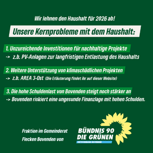 Am 2.Dezember stand im Rat die Verabschiedung des Haushaltes für 2023 an. Einen Haushalt, den wir abgelehnt haben, um ein Signal auszusenden. Zwar tragen wir den Haushalt in den größten Teilen mit und begrüßen ausdrücklich etwa den Neubau der Kita in Reyershausen, Baumaßnahmen an der Grundschule Bovenden, den Stadtumbau West, die Digitalisierung der Schulen. Auch danken wir für die zügige Einbringung und die guten Diskussionen, schließlich sind auch grüne Vorschläge im Haushalt inkludiert. Warum wir den Haushalt dennoch abgelehnen?