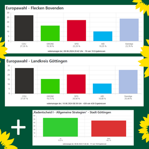 Umso dankbarer sind wir als Bovender Grüne, dass wir in Bovenden mit 16,4 Prozent ein doch vergleichsweise starkes Ergebnis eingefahren haben. Ohne einen Wahlbezirk herausheben zu wollen, war die Euphorie nach dem Ergebnis in Emmenhausen, wo wir auf 31% gekommen sind, doch sehr groß. Ein kleiner Extra-Dank sei uns daher erlaubt, ebenso nach Eddigehausen. Es zeigt, dass das Vertrauen in uns als Bovender Grüne nach wie vor hoch ist und wir arbeiten weiterhin jeden Tag daran, den Flecken immer noch ein bisschen grüner zu machen.